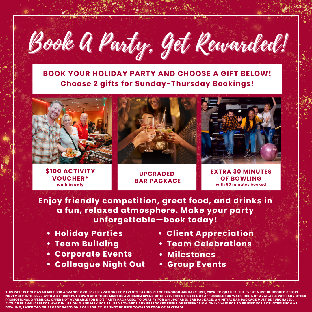 *Even better—book your party Sunday through Thursday and pick two gifts instead of one! 📅 Hurry! Offer available for events taking place through January 31, 2026. Book by December 15, 2025 with a $100 deposit and a minimum spend of $1,000.