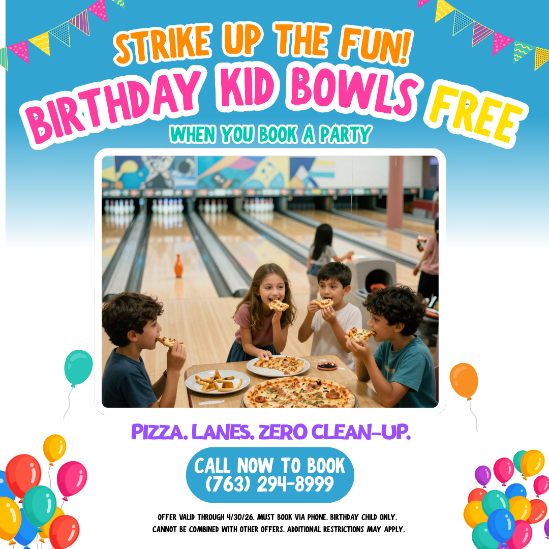 Disclaimer: Offer valid through 4/30/26. Birthday party must be booked via phone at (763) 294-8999 to redeem. Offer applies to the Birthday kids only and cannot be combined with other discounts or promotions. Additional restrictions may apply.